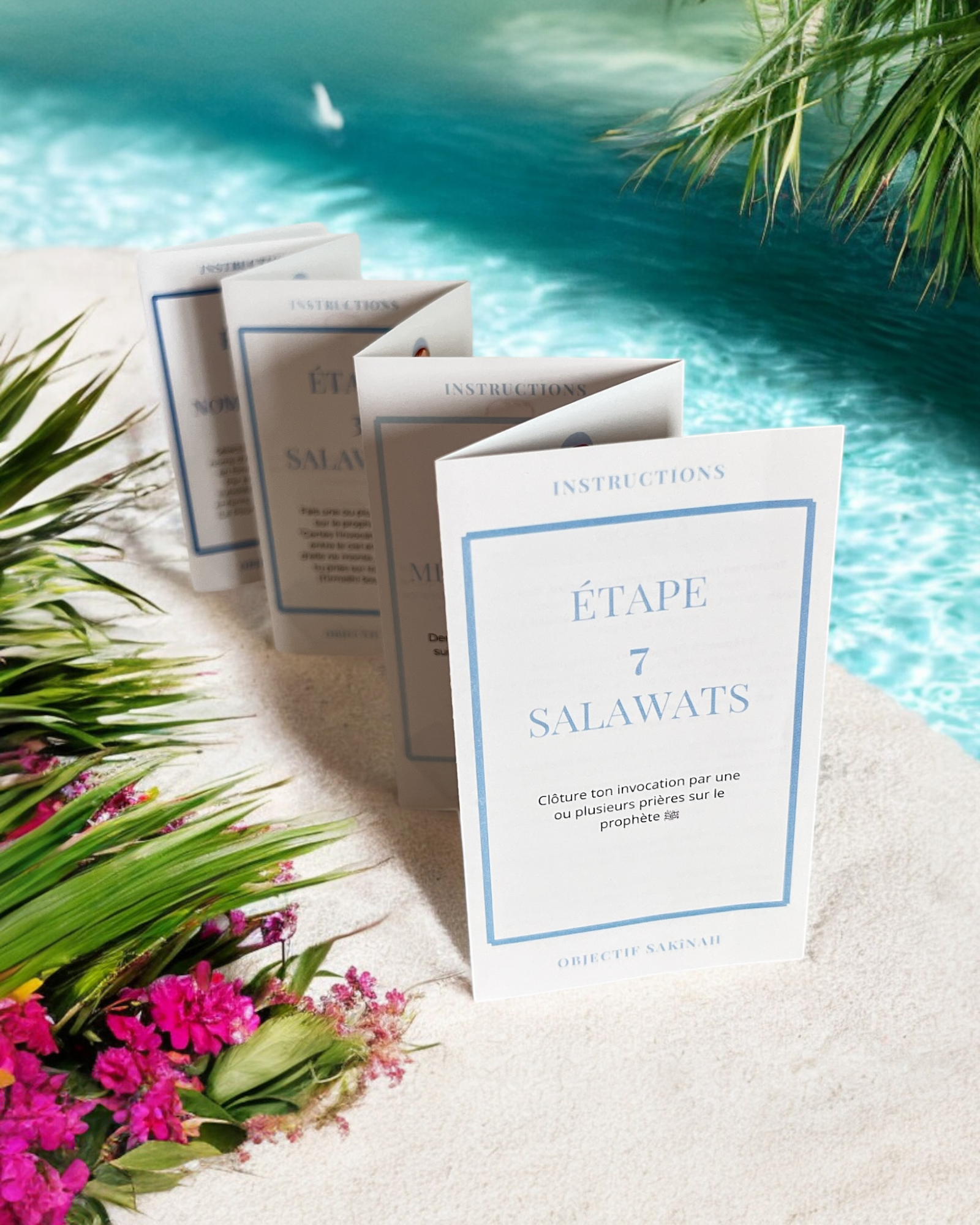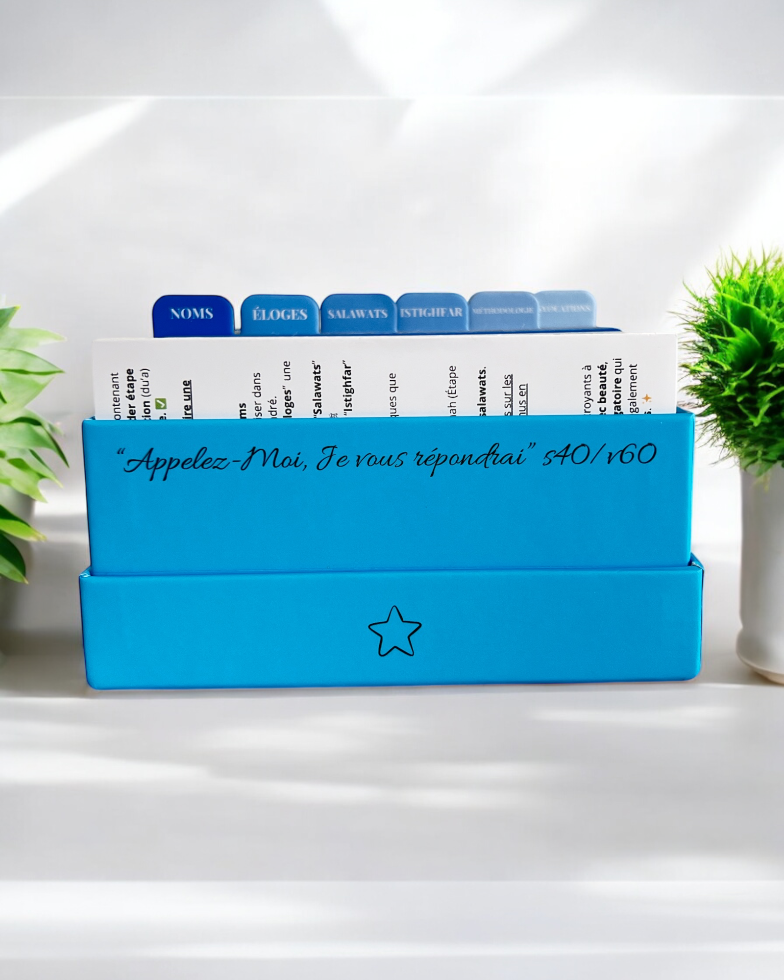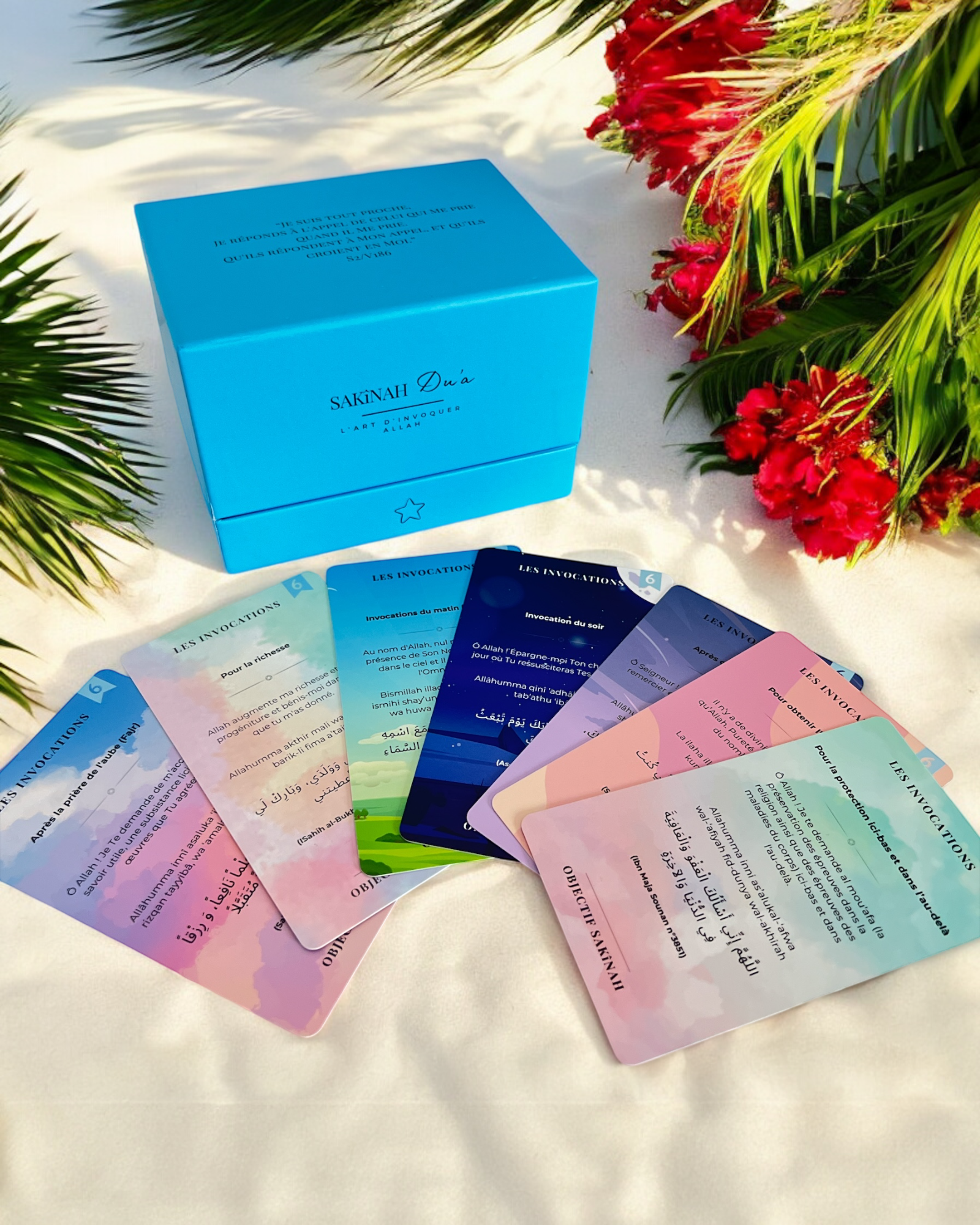 La boîte à invocation, elle, est pensée pour en plus des invocations inclure des cartes avec : les 99 noms d’Allah, des salawats, des éloges, des demande de pardon, une méthodologie claire pour savoir quand et comment invoquer, et 56 invocations variées (mariage, santé, rizq, matin, soir, etc.).