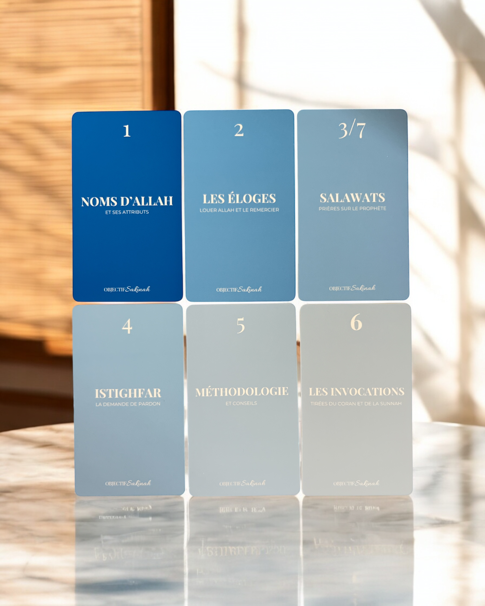 Les cartes contiennent des invocations en français/arabe/phonétique, organisés par thème, pour vous guider avec clarté à chaque étape.