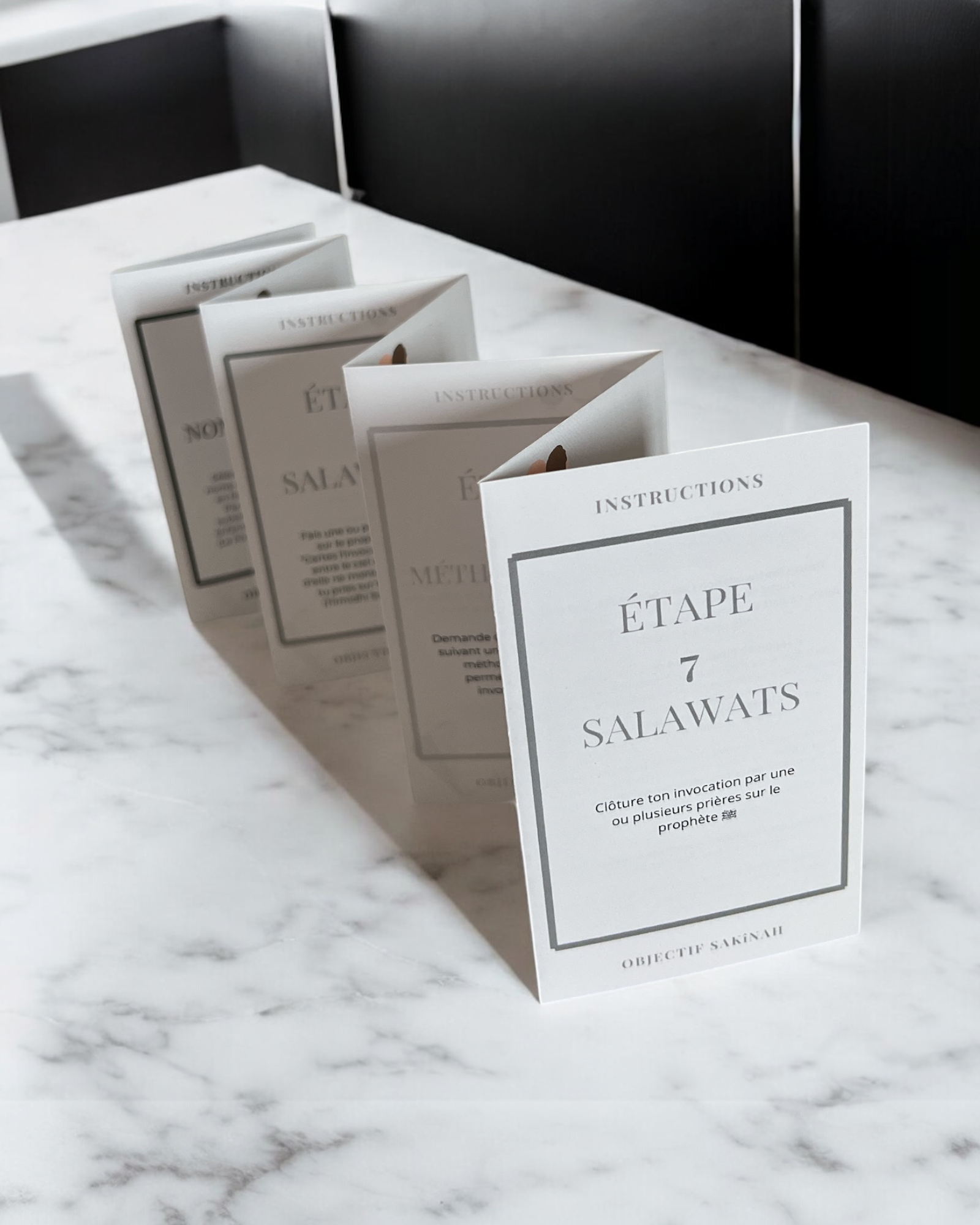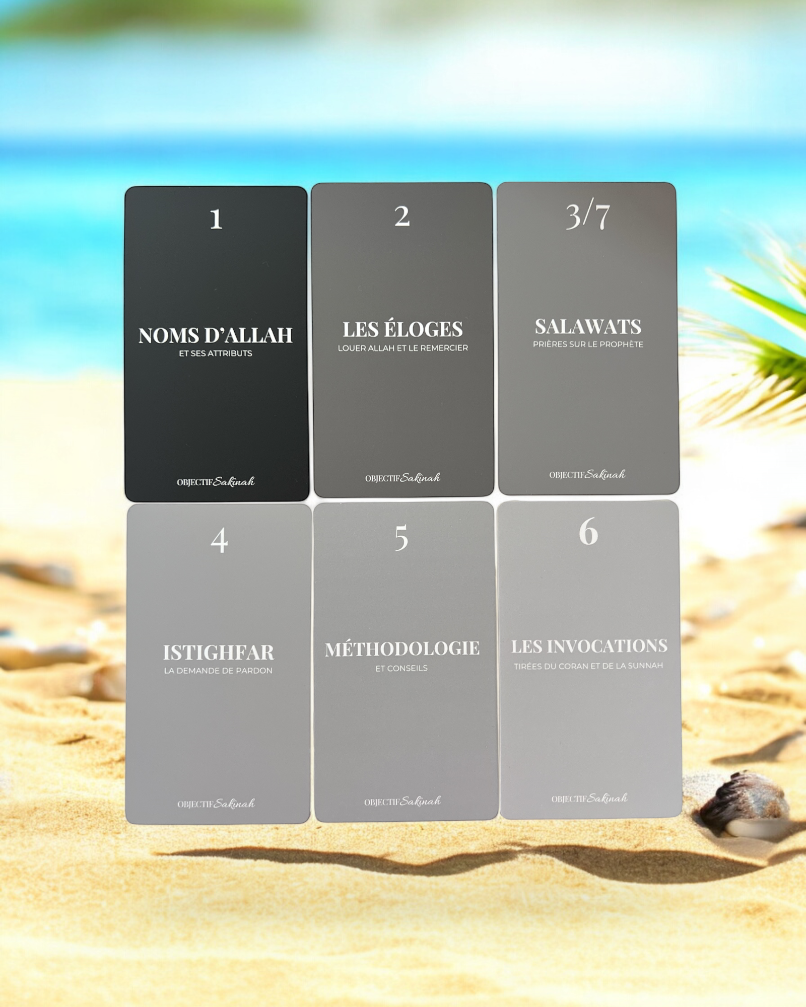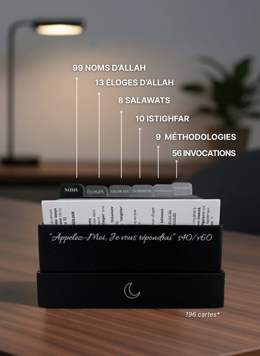 Les cartes contiennent des invocations en français/arabe/phonétique, organisés par thème, pour vous guider avec clarté à chaque étape.