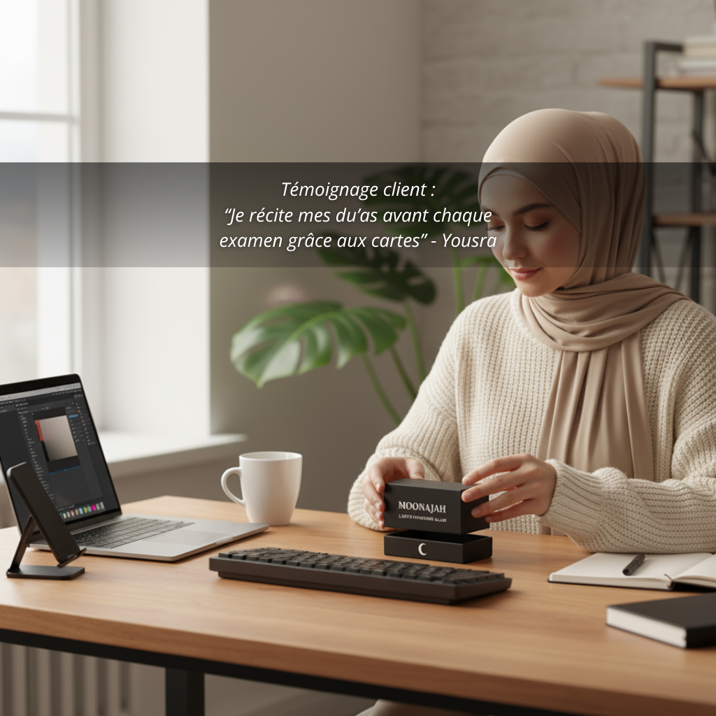 Sur votre table de chevet, dans un sac, en voyage : vos du‘a vous accompagnent partout. À tout moment, vous avez Allah à portée de cœur.